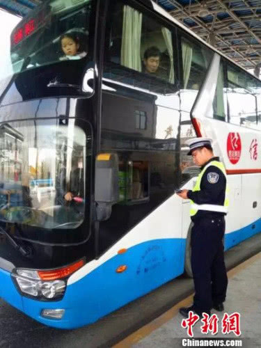 《营运客车安全技术条件》今起实施。 图为一辆客车正接受交警检查。(资料图)